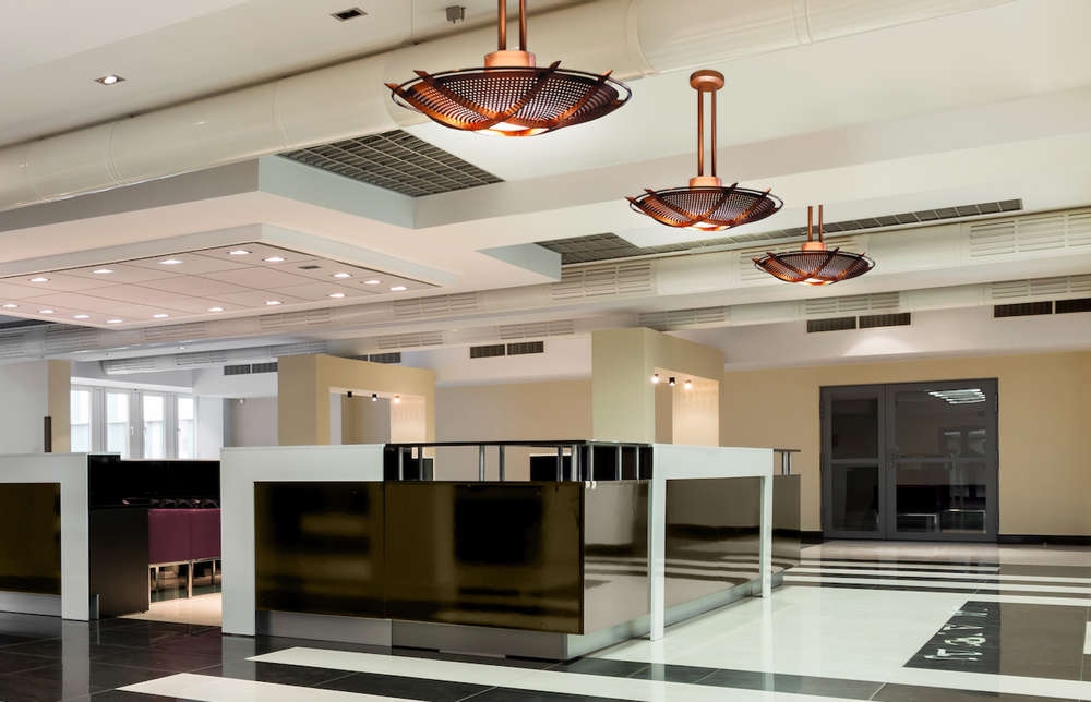 Luminaire housing consists of pendant stems and a perforated dish at the bottom. There is an acrylic lens overlay surrounding the LED module. Direct down light along with a subtle indirect up light is standard. Available in a Copper or Brass finish.